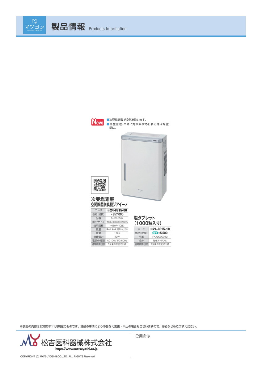 【病院専用商品】ジアイーノ用塩タブレット FKA2000012(1000ツブ)品番 24-8815-101入り 医療機器対象外 定価\5500 JAN ●定価¥5,500円(税別) ●カタログコード:24-8815-10 JANコード: メーカー品番: [●次亜塩素酸空間除菌脱臭機「ジアイーノ」用オプション品。
